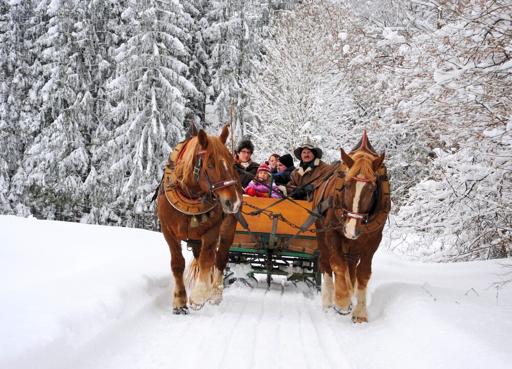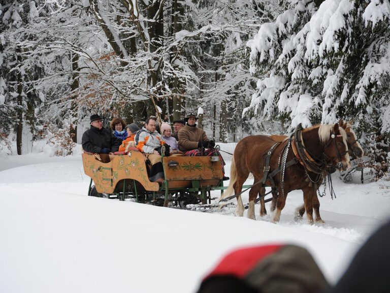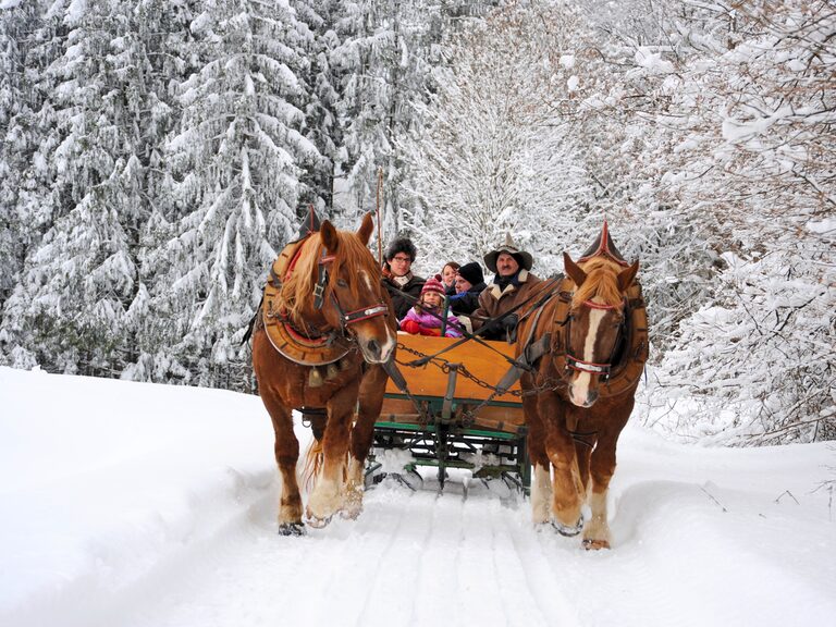 Im Winter werden die Räder zu Kufen und Sie erleben weiße Wiesen und Wälder bei der Pferdeschlittenfahrt.